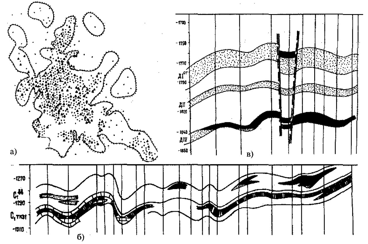 Рис. 1 а) карта контуров залежи ТТНК и турнейского яруса. Геологические профили: б) по нижнему карбону, в) по терригенному девону