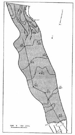 Рис. 1. Нефтяное месторождение им. Р. Требса. Нефтяная залежь в пласте «D1-II», центральный блок. Структурная карта кровли проницаемых карбонатов пласта «D2-II» нижнего девона (Мамедова и др., 1996 г.).
