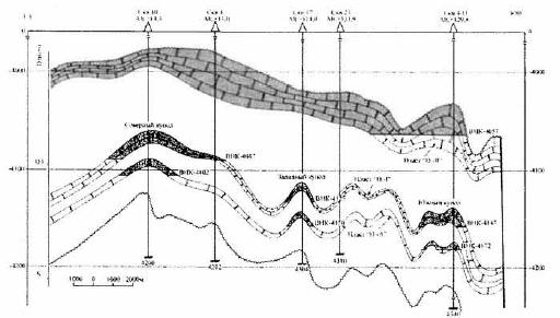 Рис. 2. Нефтяное месторождение им. Р. Требса. Геологический разрез продуктивных отложений нижнего девона по линии скважин 10-4-14-23-4-П (Мамедова и др., 1996 г.).