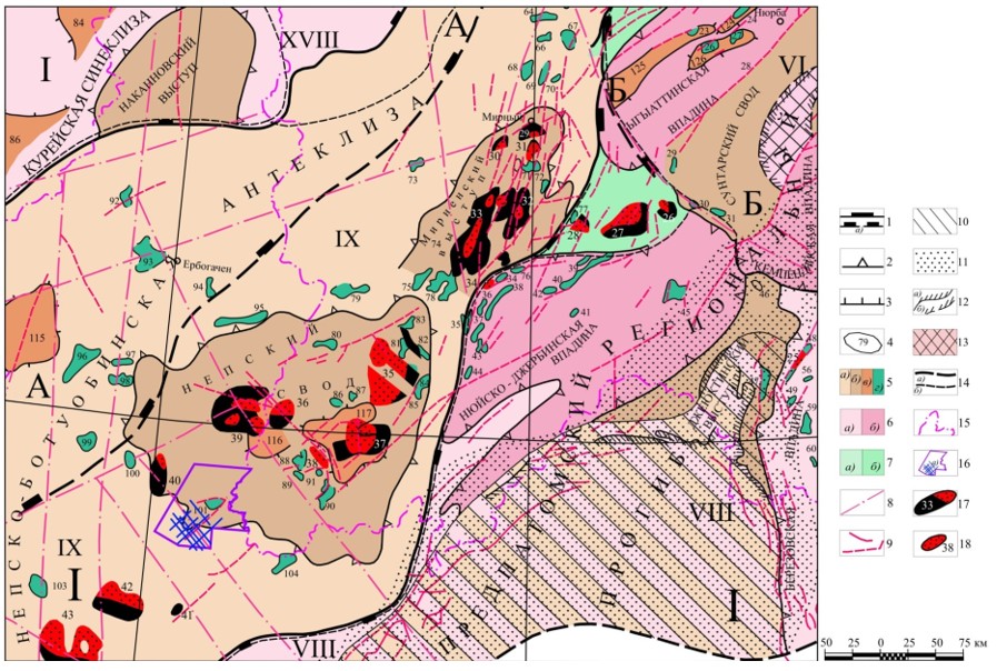 Контуры тектонических элементов: 1 - надпорядковых (антеклиз, синеклиз, региональных и краевых прогибов, ступеней), в том числе. а) – наложенных отрицательных структур (А-Тунгусская, Б-Вилюйская гемисинеклизы), 2 - первого, 3 – второго (84 - Усть-Илимпейский с. м., 86 - Илимпейский с. м., 115 - Алтыбское к. п., 116 – Верхнечонский с. м., 117 – Пеледуйское к. п., 124 –Меикско - Далырский вал, 125 – 125 Хампинский с. м., 126 - Усть - Меикский вал) и 4 - третьего (локальных перспективных на нефть и газ горизонтов) порядков. Палеозойские пликативные структуры (а - надпорядковые, б - I, в – II и г - III порядков): 5 – положительные, 6 – отрицательные, 7 - промежуточные. 8 - Стратоизогипсы (км) горизонтов венда – нижнего кембрия (подошва усольской свиты нижнего кембрия и ее аналогов в Курейской, Присаяно - Енисейской синеклизах, Байкитской антеклизе, Катангской седловине и Ангаро - Ленской ступени; кровля нижнебюкской подсвиты венда и ее аналогов на остальной территории Лено - Тунгусской НГП). Элементы дизъюнктивной тектоники: 9 – основные региональные разломы по геолого-геофизическим данным; 10 - разрывные нарушения, установленные геологической съемкой (а), сейсморазведкой и подтвержденные бурением (б); 11 - зоны шарьяжных перекрытий (с контурами структур аллохтона на изученных участках). Зоны: 12 - интенсивного рифейского прогибания, 13 - выклинивания терригенных вендских (Лено-Тунгусская НГП) отложений: а - на поверхности, б – под более молодыми осадками. 14 – выходы образований кристаллического фундамента на дневную поверхность и под отложения пермского или юрского возрастов. Границы: 15 – а) - нефтегазоносных провинций (I - Лено-Тунгусская НГП), б) - нефтегазоносных и нефтегазоперспективных областей (VI – Западно–Вилюйская, VIII – Предпатомская, IX - Непско–Ботуобинская, X - Ангаро–Ленская, XI – Катангская, XV - Северо-Тунгусская, и XVIII – Сюгджерская НГО); 16 – административные, 17 – Верхнеичерского лицензионного участка, в том числе профили отчетных сейсморазведочных работ МОГТ 2D (а). Месторождения: 18 - нефтегазовые и газонефтяные (25 – Бысахтахское, 26 - Вилюйско-Джербинское, 27 – Верхневилючанское, 28 – Иктехское, 29 – Иреляхское, 30 – Маччобинское, 31 – Нелбинское, 32 - Тас – Юряхское, 33 – Среднеботуобинское, 34 - Хотого – Мурбайское, 35 – Чаяндинское, 36 – Тымпучиканское, 37 – Талаканское, 39 - Верхнечонское, 40 – Даниловское, 41 – Пилюдинское, 42 – Дулисьминское, 43 – Аянское, 51 – Пайгинское.), 19 – газовые (38 – Таранское).