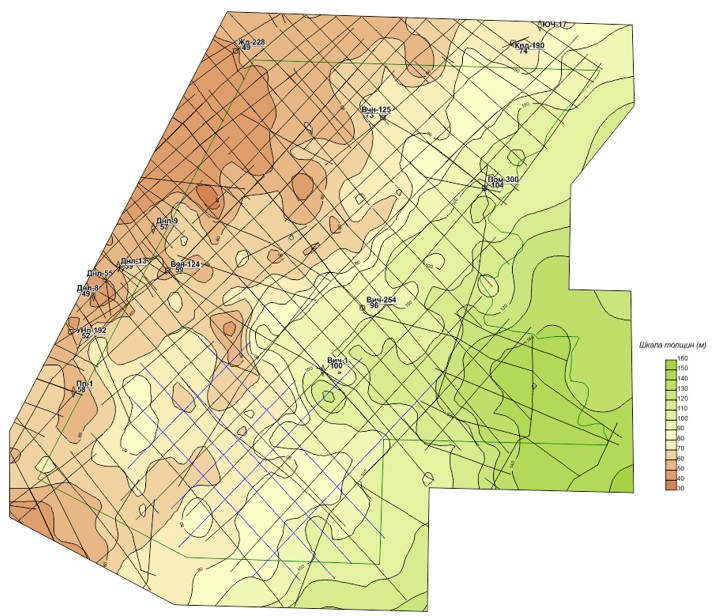 Рис.2. Карта толщин отложений непской свиты Верхнеичерского лицензионного участка (Фроликова Н.В., 2013)