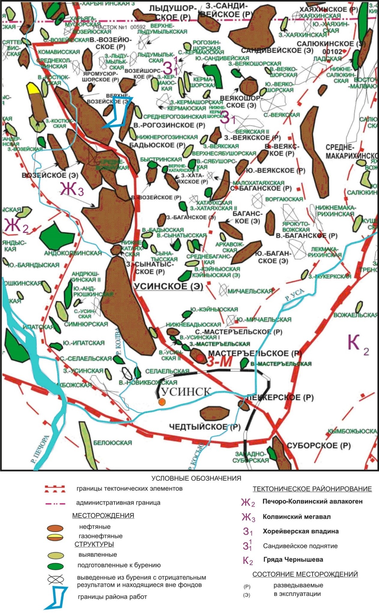 В тектоническом отношении район работ расположен в юго-западной прибортовой части Хорейверской впадины – крупного тектонического элемента первого порядка, имеющего клиновидную форму и ограниченного на западе и юго-западе Колвинским мегавалом, на юго-востоке – грядой Чернышева, на востоке – валом Сорокина (рис. 2).