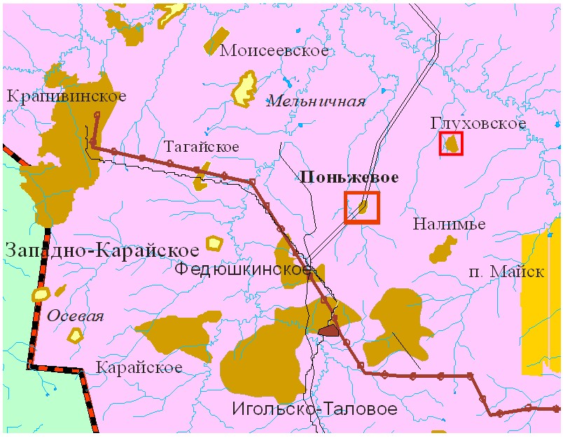 В административном отношении Поньжевое и Глуховское месторождения нефти находится в Каргасокском районе Томской области северо-восточней Федюшкинского нефтяного месторождения (рис. 1), в пределах Поньжевого участка лицензирования (51 блок), недропользователем которого является ОАО “Томскнефть” (лицензия ТОМ 00049 НЭ от 17.09.98 г.).