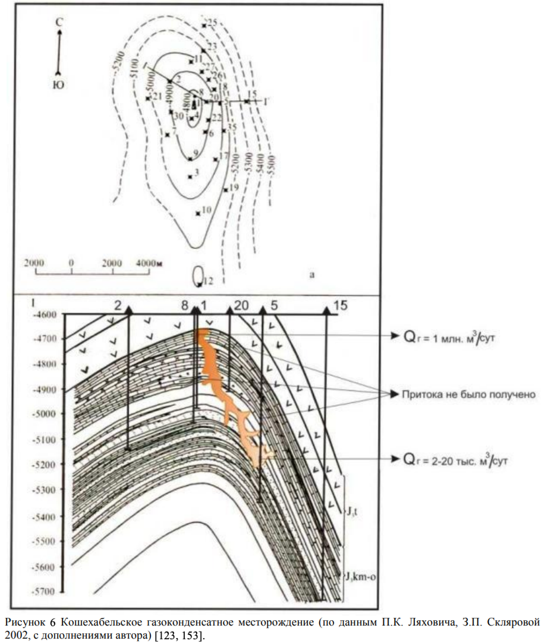 Кошехабльское ГКМ приурочено к антиклинальной складке размером 14 х 5 км по замкнутой изогипсе –5100 м и высотой 180 м. Мощный фонтан газа с глубины 5122 м был получен в 1972 г. в первой пробуренной скважине из массивных известняков оксфордского яруса, залегающих под верхнеюрской сульфатно-галогенной покрышкой. Дебит газа составлял не менее 1 млн м 3 /сут. Открытое неуправляемое фонтанирование продолжалось около месяца, после чего скважина самозаглушилась. К началу 1985 г. на месторождении было пробурено 25 поисково-разведочных скважин. В большинстве скважин притока флюидов вызвать не удалось. Коллекторы развиты спорадически. В скв. 8, заложенной на расстоянии всего 250 м от скважины-первооткрывательницы, получен сравнительно небольшой приток газа – 73 тыс. м3 /сут. Из залегающих ниже песчаников келловея газ получен в единственной скважине №5 в интервале 5340-5392 м, дебит варьировал от 2-х до 20 тыс. м3 /сут. В скв. 12, пробуренной на южной периклинали структуры, получен приток воды дебитом около 15 м3 /сут. В настоящее время месторождение находится в разработке. Вероятно, мы имеем дело с жильным типом газоконденсатного месторождения.