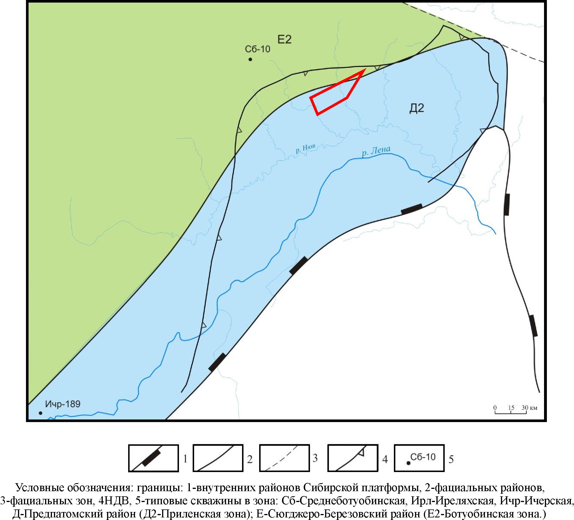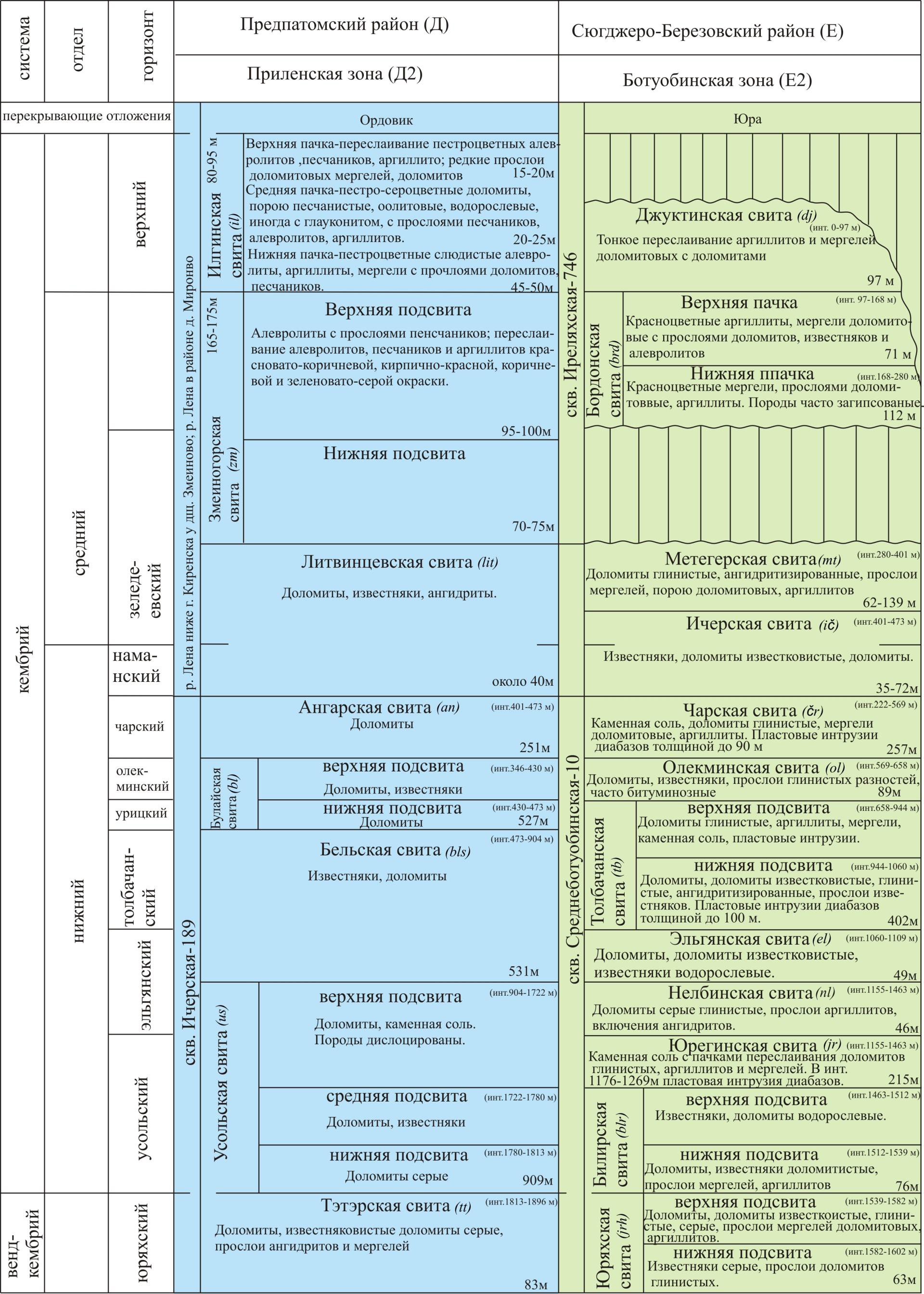 Согласно фациальному районированию кембрийских отложений внутренних районов Сибирской платформы исследуемая территория в основном отнесена к Приленской зоне Предпатомского внутреннего района Сибирской платформы (см. рисунок 2). На практике традиционно используются названия аналогов свит, распространенных в Ботуобинской зоне Сюгджеро-Березовского района, корреляция которых со свитами Приленской зоны.
