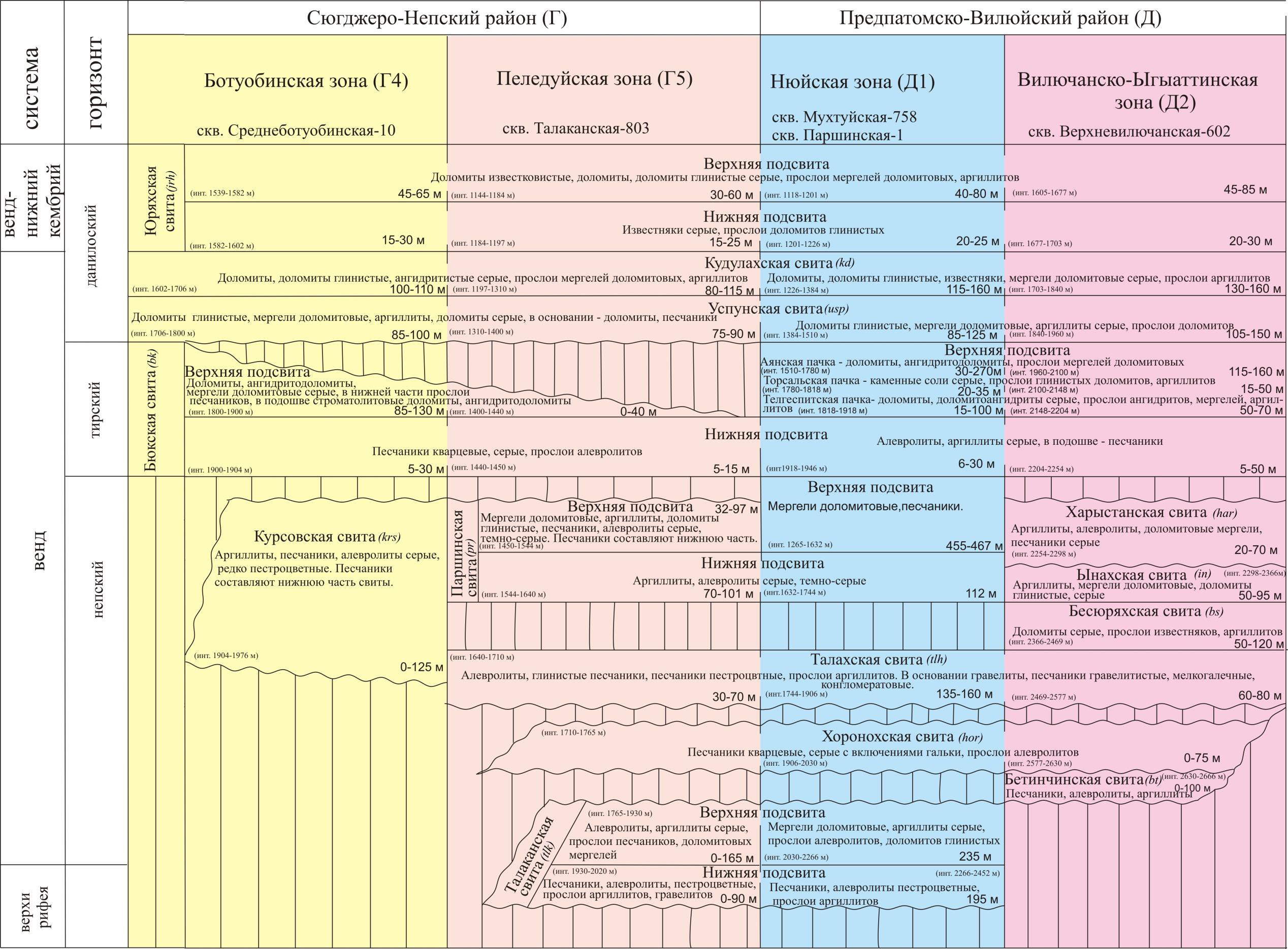 Кембрийские отложения на территории исследования распространены повсеместно и представлены всеми тремя отделами. Наиболее полно представлены нижнекембрийские отложения. Разрез нижнего-среднего кембрия представлен соленосно-карбонатными отложениями, а верхний отдел – глинисто-карбонатными. В скважинах, пробуренных в пределах лицензионного участка, расчленение кембрийских отложений проведено в соответствии со стратиграфическими подразделениями, принятыми в Ботуобинской зоне. Стратиграфическая схема нижнекембрийских отложений показана на рисунке 2.4.