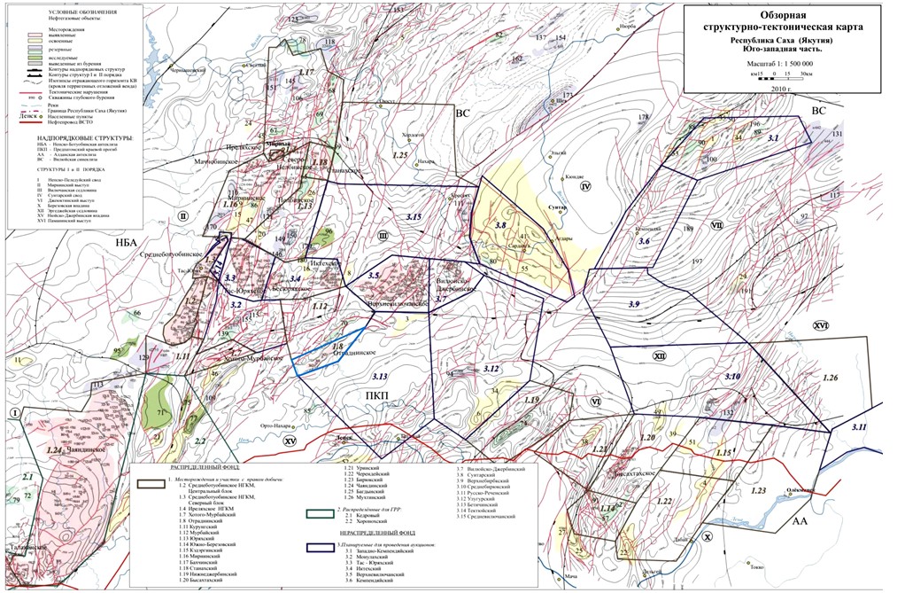 В тектоническом плане Отраднинский лицензионный участок находится на северном борту Нюйско-Джербинской впадины, являющейся структурой первого порядка в составе Предпатомского прогиба. На севере борт впадины граничит по системе субширотных разломов с Мирнинским сводом Непско-Ботуобинской антеклизы и Вилючанской седловиной (Рис. 5).