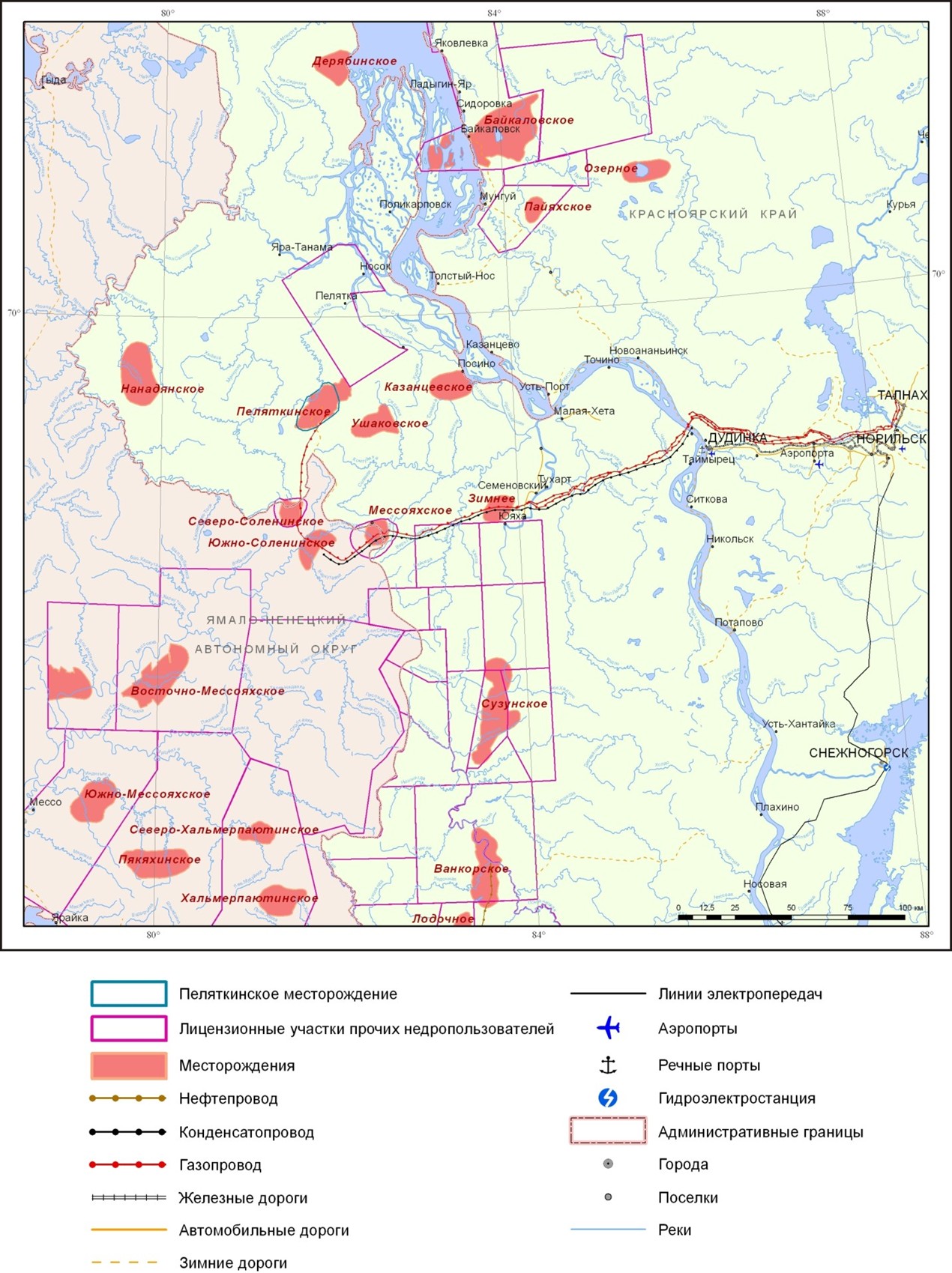 Пеляткинское газоконденсатное месторождение расположено в Танамской нефтегазоносной зоне (НГЗ) Енисей-Пясинского нефтегазоносного района (НГР) Енисей-Хатангской нефтегазоносной области (НГО) на территории Красноярского края. На юге Енисей-Хатангской нефтегазоносная область (НГО) граничит с Пур-Тазовской НГО, а на западе – с Гыданской НГО. Фрагмент карты нефтегазоносности района работ приведен на рисунке (Рис. 3).