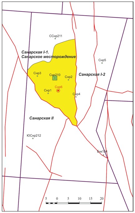 Источник: УТОЧНЕНИЕ ГЕОЛОГИЧЕСКОЙ МОДЕЛИ ПО МЕСТОРОЖДЕНИЮ НА САНАРСКОМ лицензионном участке (ПО РЕЗУЛЬТАТАМ БУРЕНИЯ СКВАЖИНЫ САНАРСКАЯ-6). Перелыгин А.И. 2014