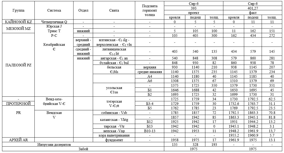 Таблица 1. Геологический разрез, проектный и фактический вскрытый скважиной Снр-6