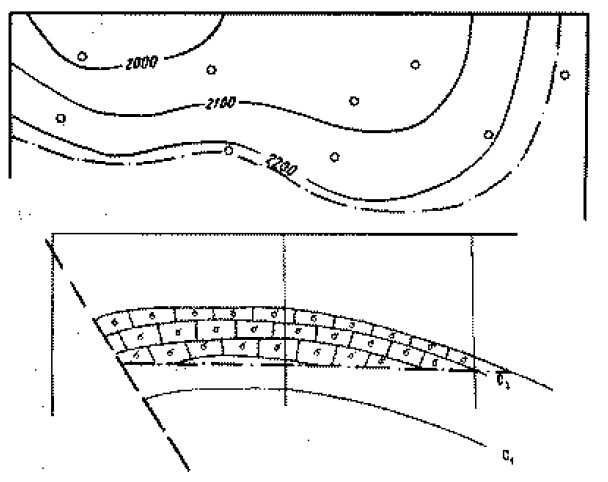 Рис.1. Саратовское месторождение. Структурная карта по кровле среднего карбона. Геологтческий профиль.