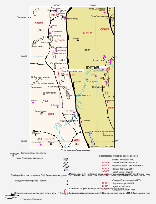 Северо-Савиноборское нефтяное месторождение расположено в центральной части Мичаю-Пашнинского вала - тектонического элемента II порядка, выделяемого в составе Ижма-Печорской впадины на ее границе с Верхнепечорской впадиной Предуральского краевого прогиба. Мичаю-Пашнинский вал приурочен к мобильной зоне Илыч-Чикшинского глубинного разлома и имеет инверсионную природу. Морфология сводовой поверхности вала представлена субмеридионально вытянутой цепочкой брахиантиклинальных поднятий, большая часть которых контролирует скопления углеводородов. С одной из структур – Северо-Савиноборской – связано одноименное месторождение нефти, являющееся объектом настоящих исследований.