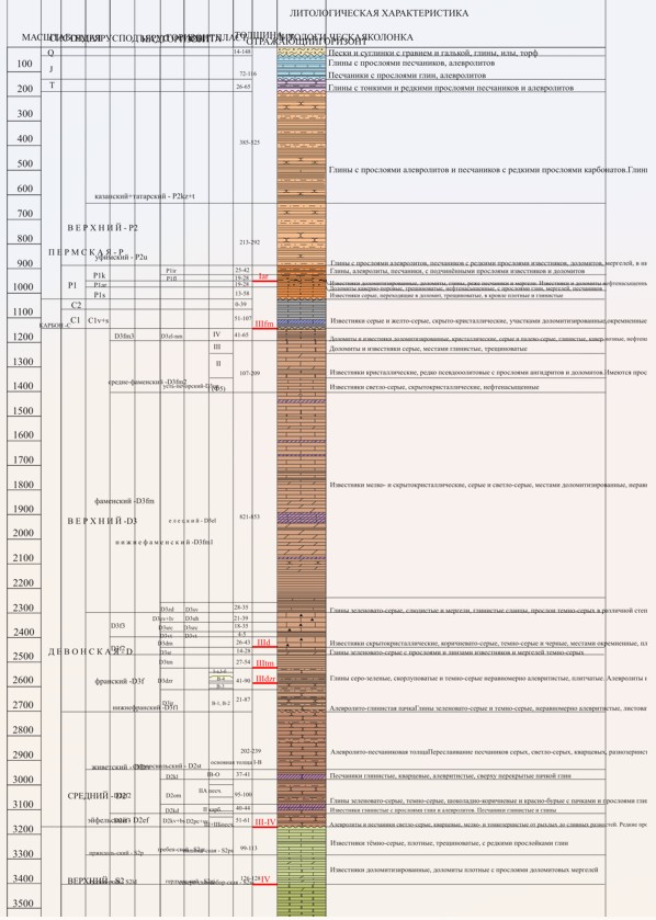 Литолого-стратиграфическая характеристика разреза приводится в соответствии со стратиграфической схемой Тимано-Печорской провинции (2001 г.). При характеристике продуктивной части разреза использована индексация промысловых пачек и пластов, используемая в практике геологоразведочных работ в южной части провинции (рис 2).