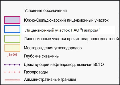 Источник: Оперативный подсчёт начальных геологических и извлекаемых запасов УВ по результатам поискового бурения 2016 г. на Южно-Сюльдюкарском лицензионном участке. Договор № СНГ-2017/07-07 от 19.07.2017 г. Трухин В.Ю., Вотякова Т.А,, Колотущенко Л.Д., и др. 2017