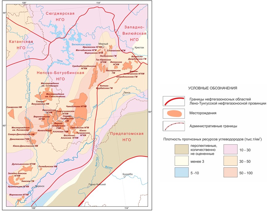 Согласно принятой схеме нефтегазогеологического районирования территории Сибирской платформы [Конторович и др.] Сюльдюкарское месторождение относиться к Непско-Ботуобинской нефтегазоносной области Лено-Тунгусской нефтегазоносной провинции (Рис. 6). В пределах нефтегазоносной области открыт ряд месторождений нефти и газа, среди которых необходимо отметить уникальное по запасам газа с конденсатом Чаяндинское месторождение. Крупными по запасам нефти здесь являются Ярактинское, Верхнечонское, Талаканское, Верхневилючанское, Среднеботуобинское и Чаяндинское месторождения.