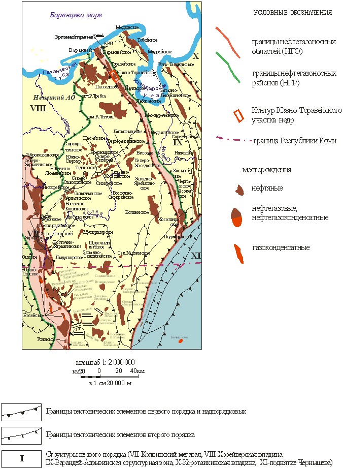 Рис.2. Фрагмент обзорно-тектонической схемы Тимано-Печорской провинции