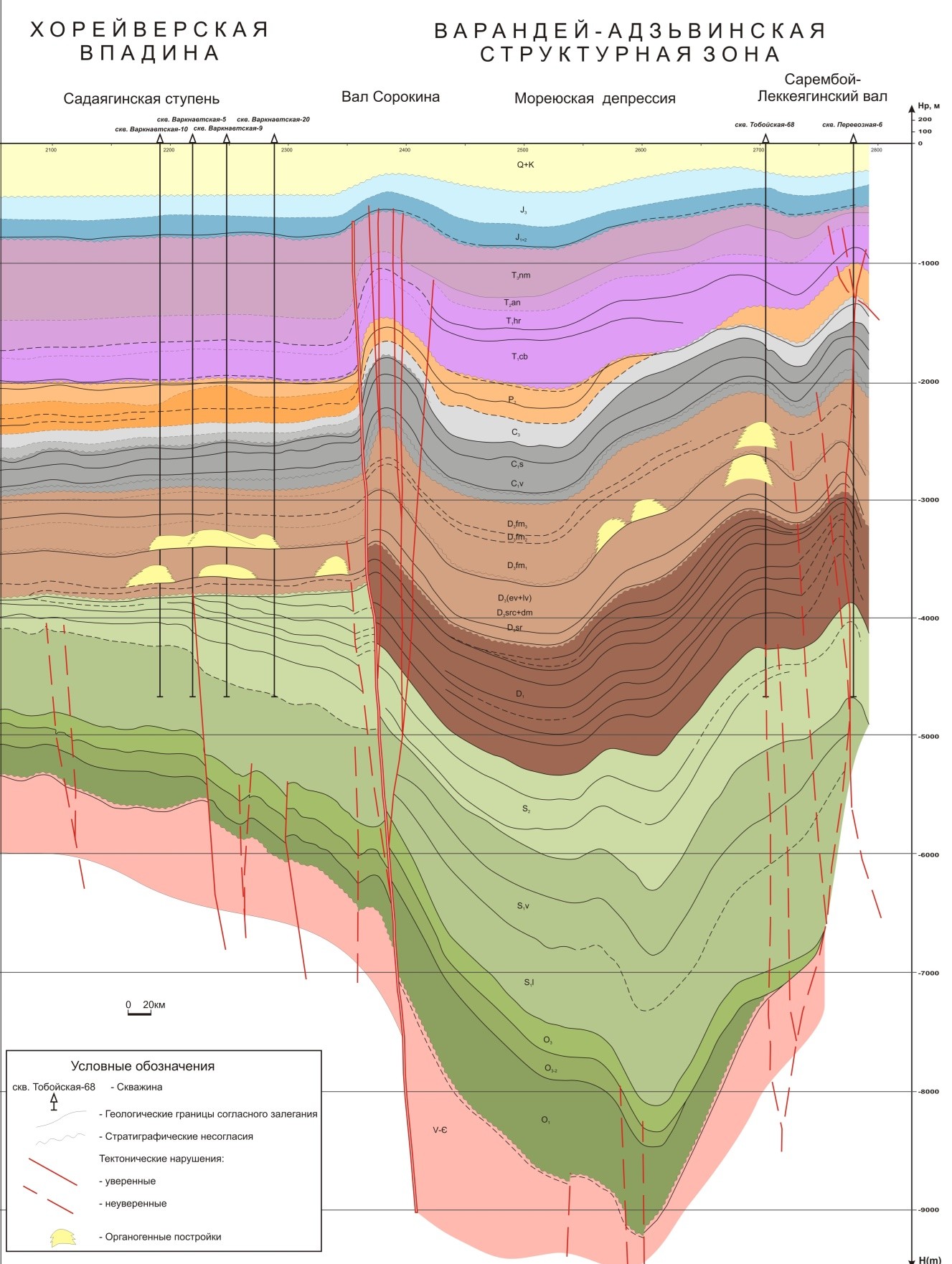 Основной структурной особенностью Варандей-Адзьвинской зоны является чередование линейных дизъюнктивных валов преимущественно северо-западного простирания и разделяющих их депрессий, выраженных по всему разрезу осадочного чехла: валы Сорокина, Гамбурцева, Сарембой-Леккейягинский и Талотинский, Мореюская и Верхнеадзьвинская депрессии (Рис. 3). Все валы представляют собой линейно вытянутые объекты, имеют сложное горстово-чешуйчатое строение и разбиты высокоамплитудными (200-400 м) дизъюнктивными нарушениями на клиновидные блоки, к которым приурочены локальные структуры. Депрессии четко ограничены валами и приподнятыми зонами, амплитуда прогибания достигает 1000 м и более. Локальные структуры, выделяемые в депрессиях, располагаются, как правило, в пределах их бортовых зон.