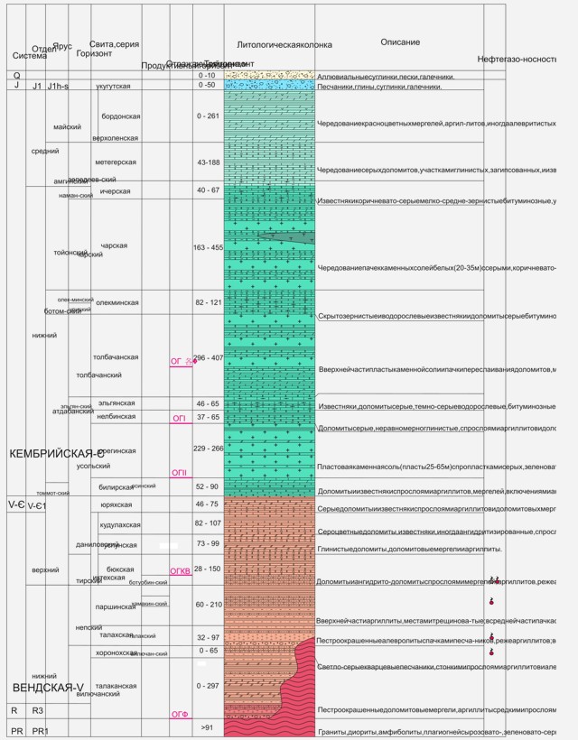 В разрезе осадочного чехла Непско-Ботуобинской НГО установлено четыре нефтегазоносных комплекса (НГК), различающихся геологическим строением: рифейский, вендский, верхневендско-нижнекембрийский и кембрийский; в пределах Ботуобинского НГР развиты только два из них: вендский (вилючанский, хамакинский, ботуобинский горизонты) и верхневендско-нижнекембрийский (пласты Ю-I, Ю-II и Ю-III юряхского горизонта, пласты О-I и O-II осинского горизонта).