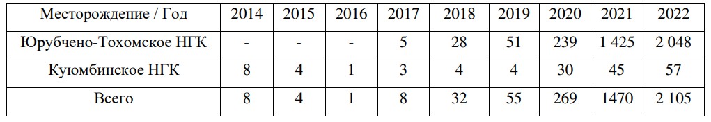 Таблица 2. Динамика добычи свободного газа и газа газовых шапок месторождений Лено-Тунгусской нефтегазоносной провинции (Байкитская нефтегазоносная область), млн. м3