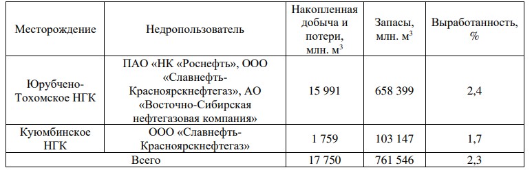 Таблица 1. Сырьевая база свободного газа и газа газовых шапок месторождений Лено-Тунгусской нефтегазоносной провинции (Байкитская нефтегазоносная область) по состоянию на 01.01.2023 г.
