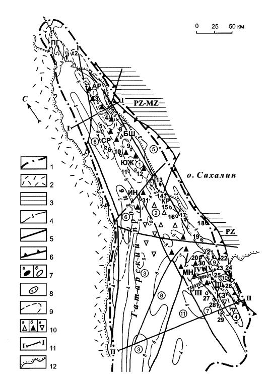 Тектоническое строение. Границы бассейна разломные, на западе он ограничен Сихотэ-Алиньским вулканогенным поясом, на юге – группой Южно-Татарских поднятий и отделен хребтом Окусири от глубоководной впадины Японского моря, на востоке его обрамляют горстовые сооружения Западно-Сахалинского поднятия.