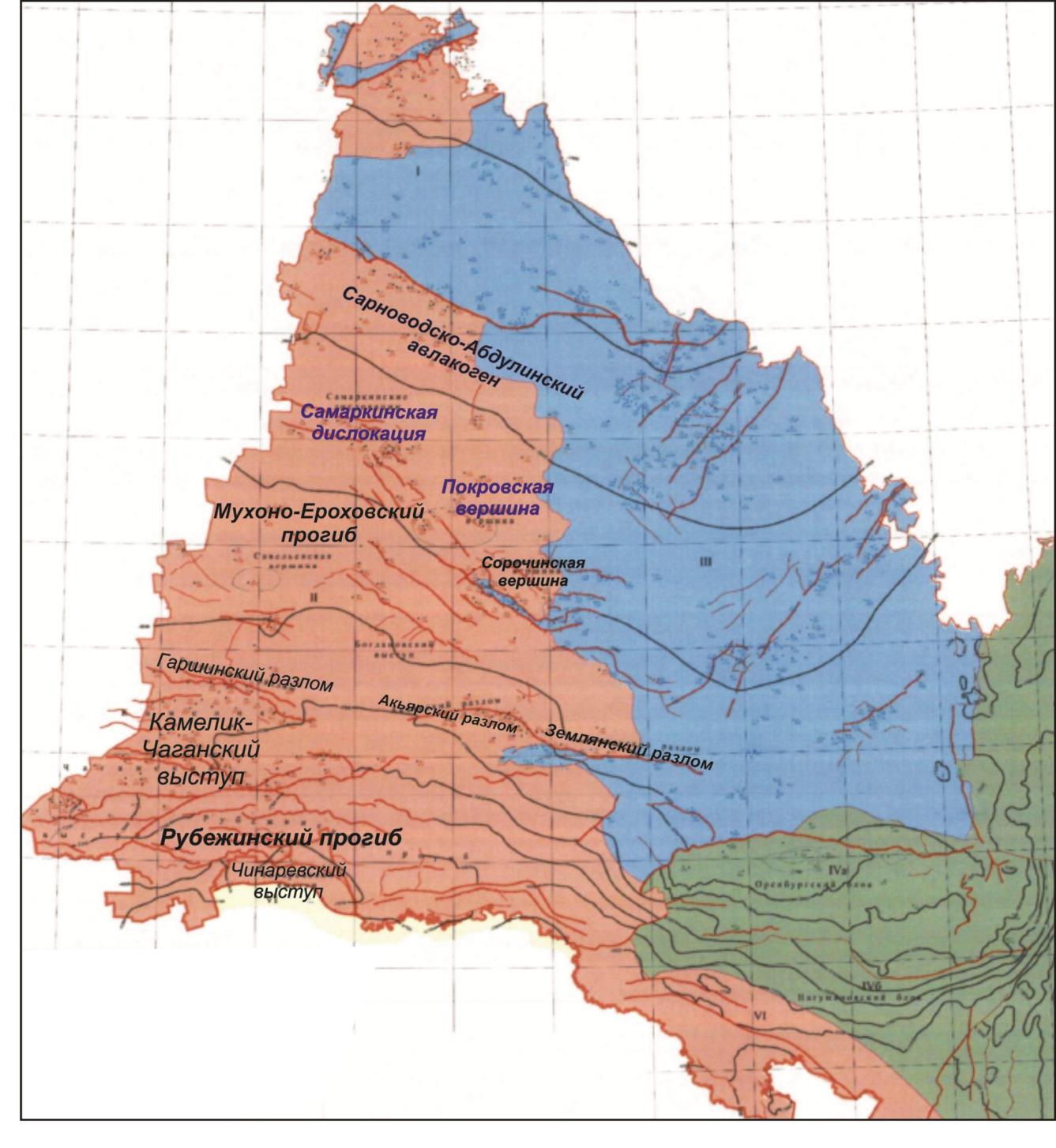 I - Татарский свод, II - Бузулукская впадина, III - Восточно-Оренбургское сводовое поднятие, IV - Соль-Илецкий НГР