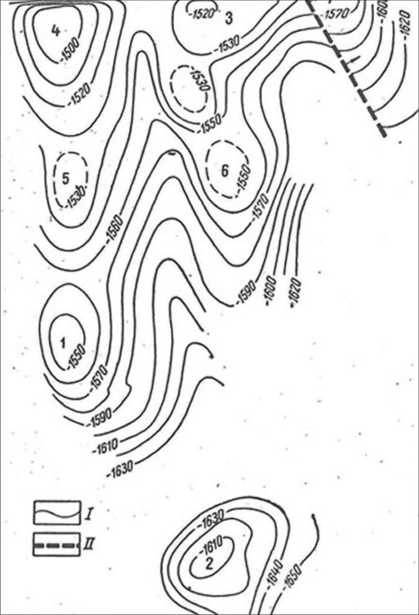 I – изогипсы кровли тульского горизонта, II – тектоническое нарушение