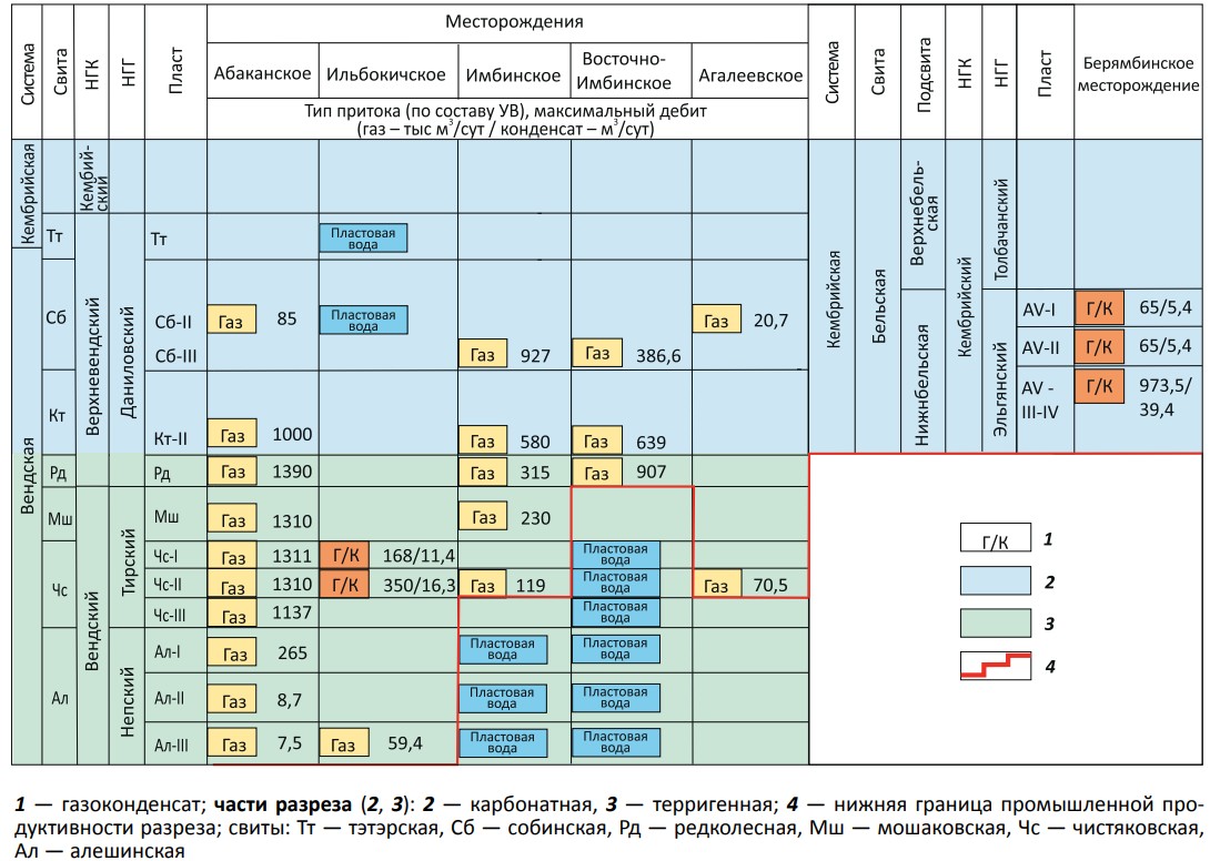 Все месторождения, открытые на территории Ангарской зоны складок, являются многозалежными. Этаж газоносности охватывает непский, тирский и даниловский горизонты венда. На Берямбинском месторождении продуктивны нижнекембрийские отложения бельской свиты, эльгянский горизонт. С северо-запада от Абаканского месторождения на юго-восток до Берямбинского нижняя граница этажа промышленной продуктивности постепенно поднимается от непского уровня до эльгянского (рис. 1,2). Залежи являются структурными, тектонически и литологически ограниченными.