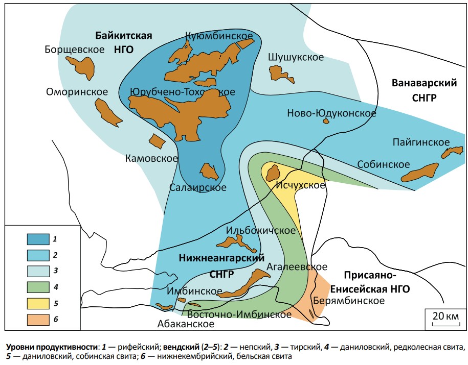 Схема нефтегазоносности венд-нижнекембрийских отложений Нижнеангарского самостоятельного нефтегазоносного района