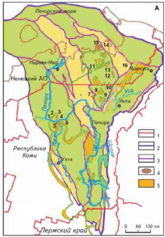 В Хорейверской впадине, в ее юго-западной части, расположено три месторождения нефти, где залежи находятся в доманиковых отложениях - Западно-Хатаяхское, Баганское, Верхнемакарихинское.В центральной части впадины расположено Восточно-Колвинское месторождение. В восточных и северо- восточных районах впадины расположены месторождения Колвинское, Западно-Ярейягинское, Пасседское и им. Р.Требса, где присутствуют залежи нефти в разнофациальных отложениях доманикового горизонта. Глубина залежей нефти на территории Республики Коми менее 3500 м; в пределах Ненецкого АО достигает глубины более 3,900 м (им. Р.Требса).