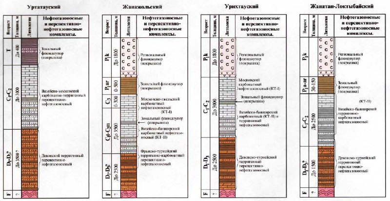 Урихтауский тип разреза (рис. 3,4) характеризует район карбонатного уступа, т.е. западные участки Жанажойской карбонатной платформы. В целом он сопоставим с Жанажольским типом разреза и отличается от него только отсутствием ассельско-артинских и верхнекаменноугольных отложений. В связи с последними особенностями главной и единственной покрышкой над карбонатным резервуаром являются соленосные отложения кунгура.