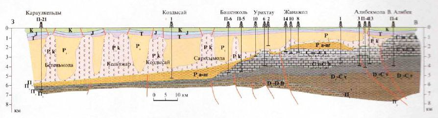 Рис. 4. Геологический разрез Жанажольской и Акжар-Коздысайской НГЗ.